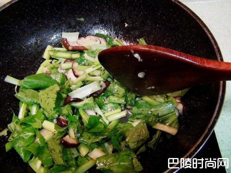 4待香菇炒吸取汤汁变色,下油菜加入烹大师炒数下即可。