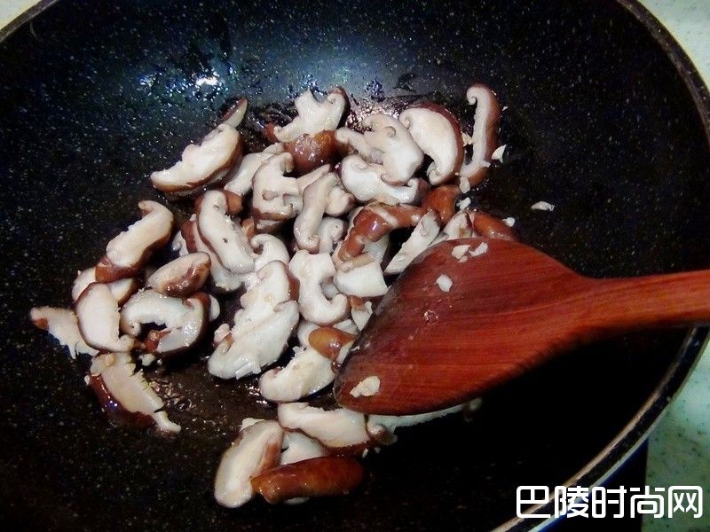 3下香菇拌炒,加入盐巴。