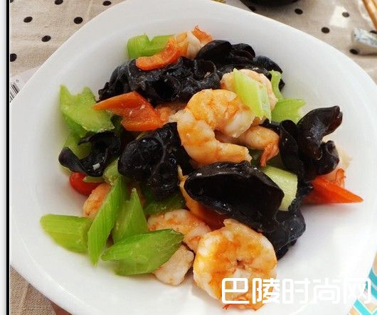 2、木耳提前用水泡发,洗净,去蒂,撕成小块;西芹洗净,切成块;红椒洗净,去籽,切块。