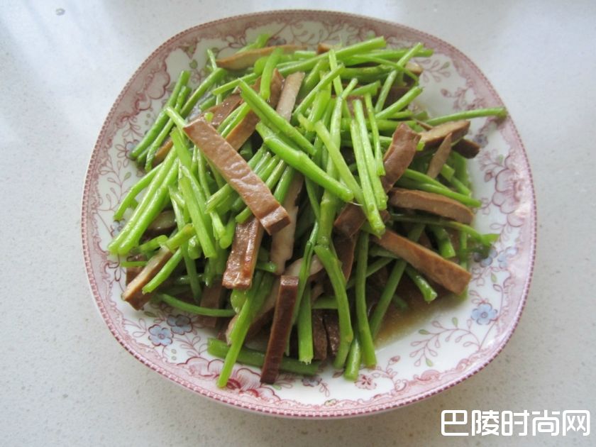 做法1、去叶和老筋洗净掐段,豆腐干切条,葱洗净切末。