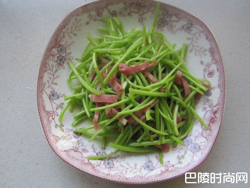 3、放芦蒿、盐爆炒,芦蒿变深绿即可。
