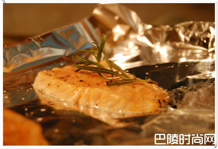 2、烤盘铺上锡纸,将腌制的三文鱼放在锡纸上,送进烤箱。