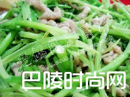 4.锅内留底油,放葱、姜、香菜煸炒后放肉丝,再放盐、料酒迅速炒匀,熟后淋上香油即成。