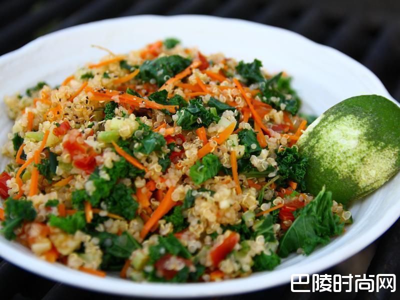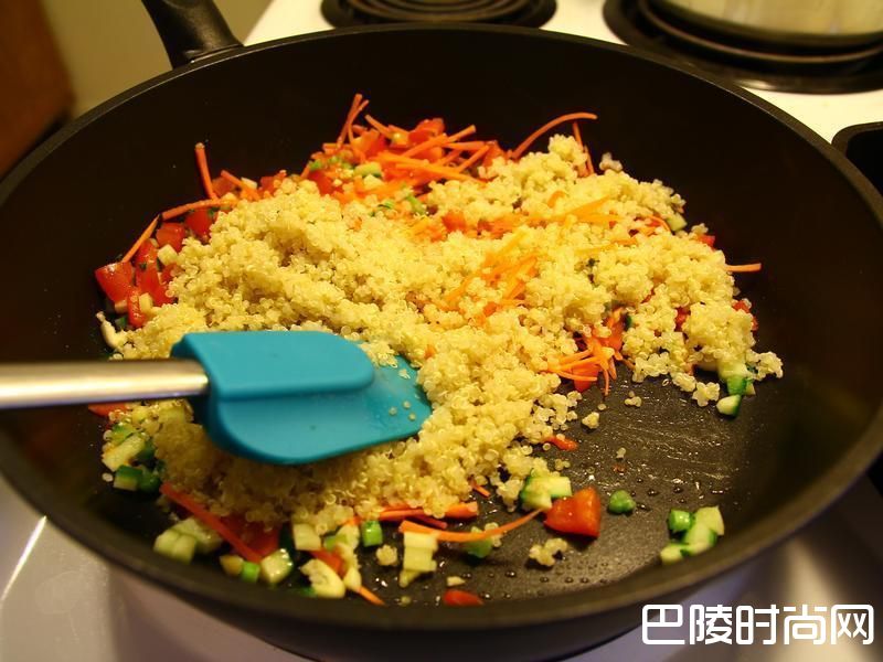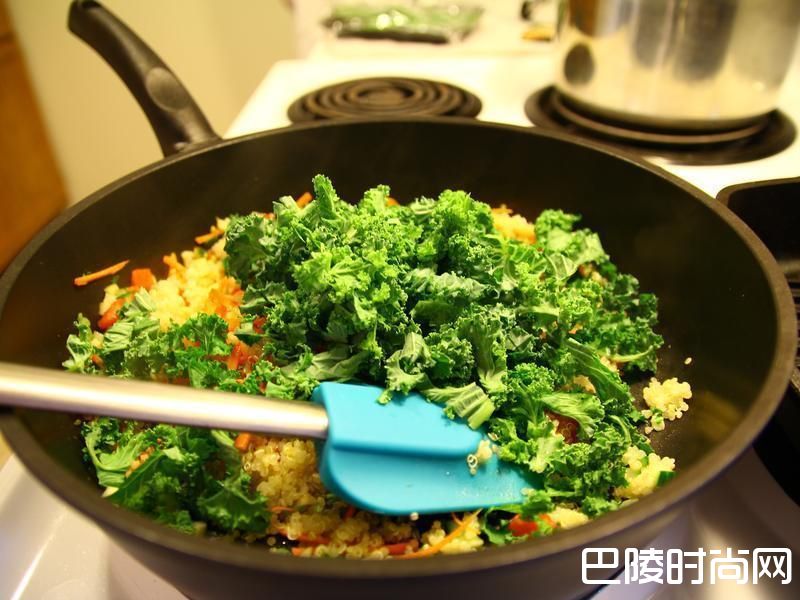 4热锅加点油炒大蒜,出香味炒出来后放入羽衣甘蓝的梗,后加入胡萝卜、番茄,小黄瓜与藜麦拌炒。