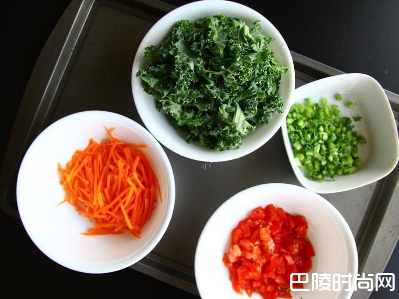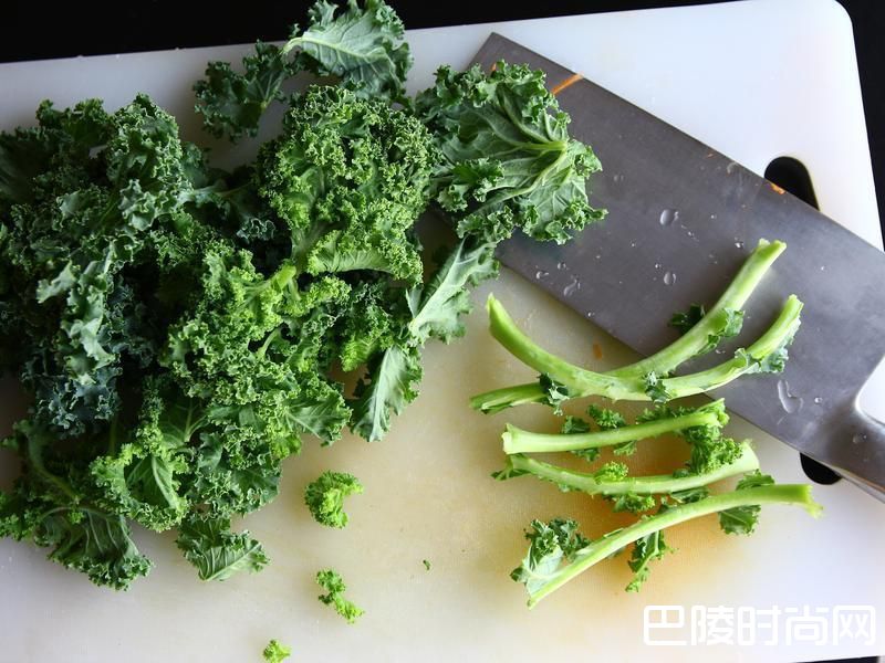1羽衣甘蓝洗净,梗与叶子分开,梗切小丁,叶子切段。