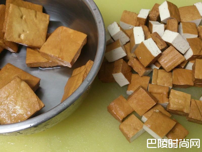 3加酱油煸香豆干,使之均匀上色,
