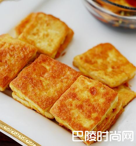 4、锅中加油,烧至7成热,放入豆腐块煎至两面变金黄,装盘;