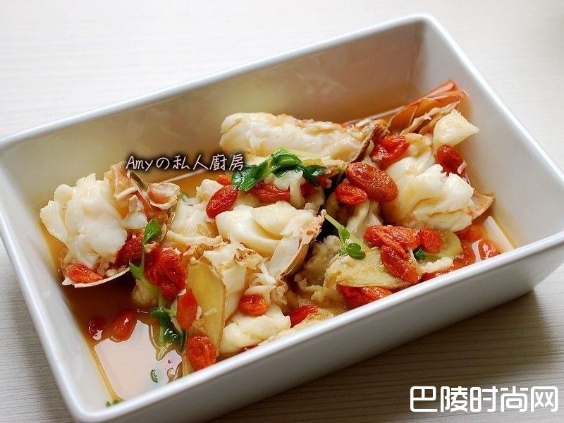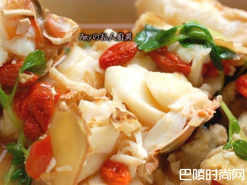 龙虾肉(龙虾头可煮味噌汤)半只 姜片5-6片 麻油一大匙 枸杞少许 当归一小片 米酒100cc 海盐少许 做法