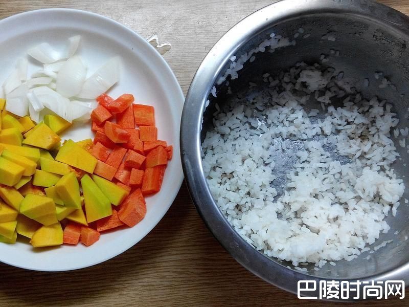 南瓜适量 红萝卜少量 洋葱少量 剩饭或燕麦少量 盐适量 黑胡椒适量 做法