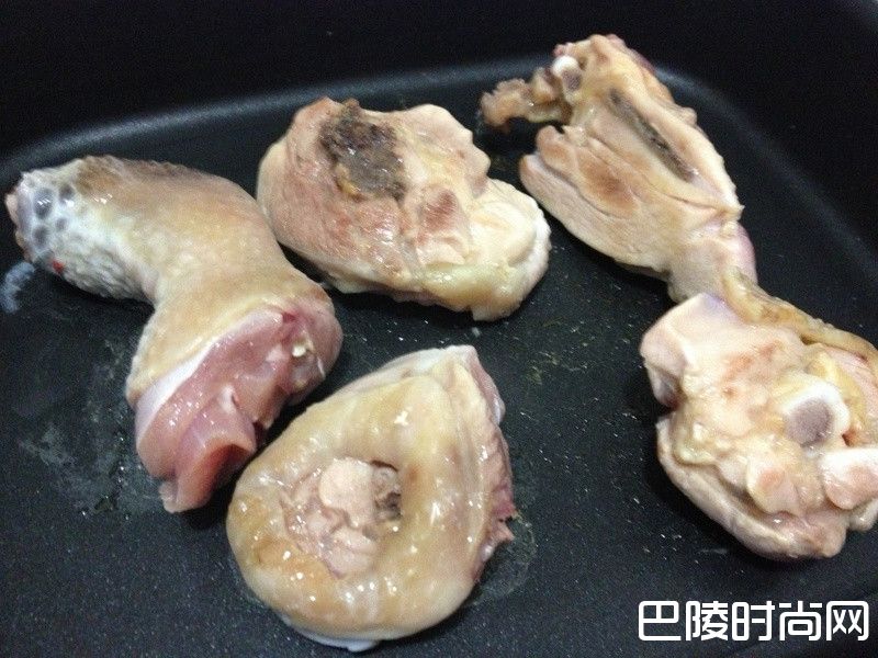 1先热锅,把鸡腿肉表面先煎熟,这时候可以赶快来削萝卜皮跟切块。