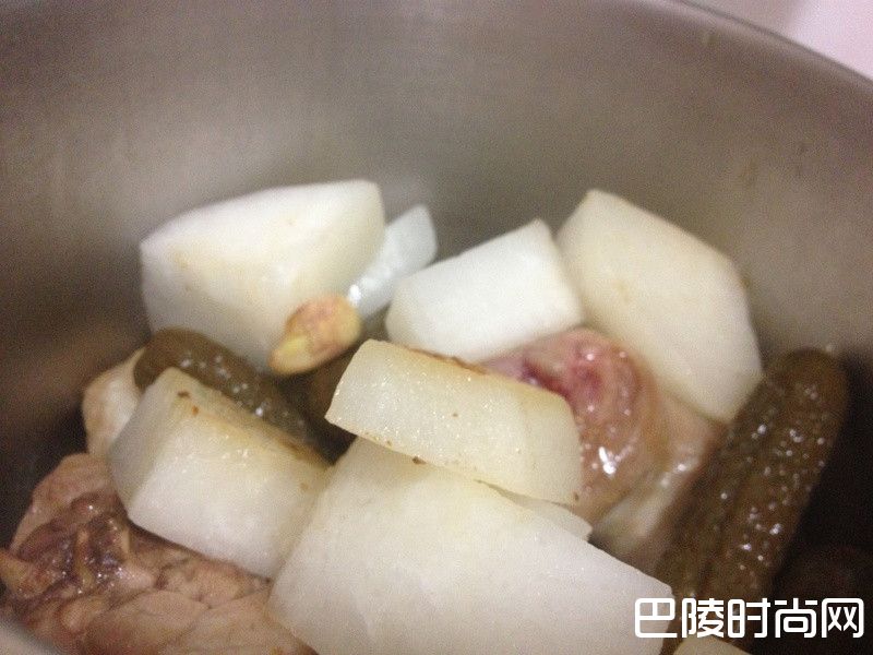2把切好的萝卜、蒜头放入盖上盖子闷煮顺变热一下,这样子是可以煮汤的时候不用煮太久。