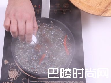 2把水倒入锅中,待水煮沸后,把花椒、八角、干辣椒、桂皮和盐放入锅中