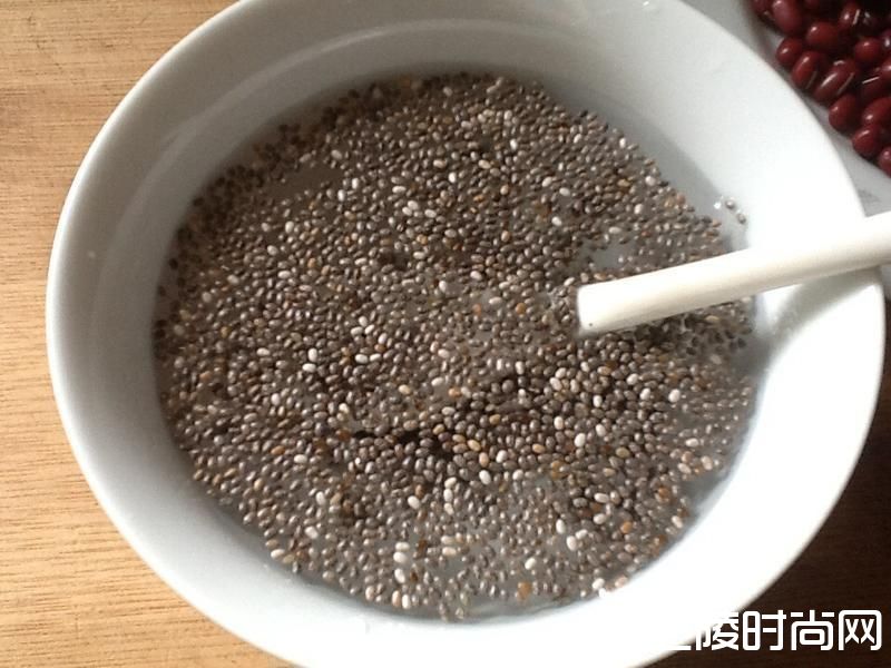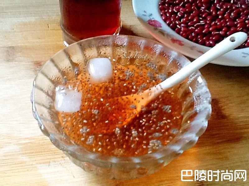 5取放凉的红豆水约400-500cc,加入2茶匙的奇亚籽,于以搅拌之,约3-5分钟使其充分吸收水份即可。(可加入少许的冰块),奇亚籽要喝时再加即可,要喝多少红豆水再加奇亚籽)。