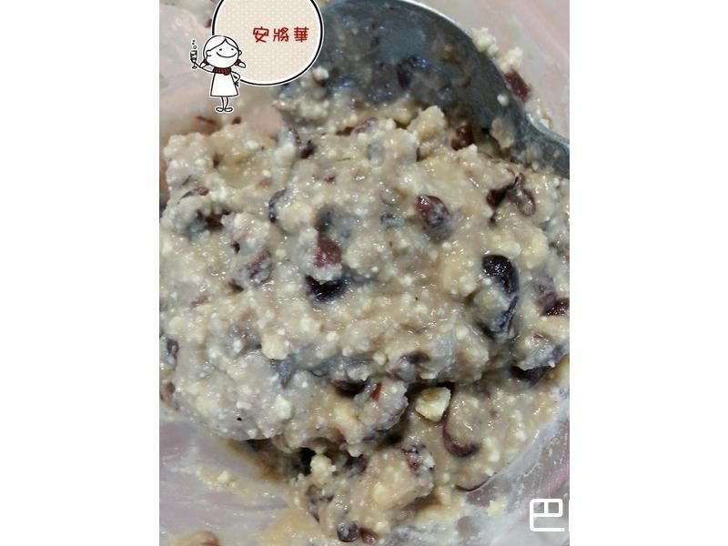 4因前次制作各自剩下少许红豆跟奶酥,将它们混合均匀,水水们也可以自己重新制作,或是将冰箱内剩余的各式馅料拿来制作也可,偶而也要清清冰箱喔!