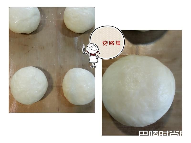 3将打好的面团连内锅一起取出,盖上塑胶袋基发15分。基发好,取出面团甩打几下,感觉不黏手即可切割,分64g一个可分6个,稍为滚圆,盖上塑胶袋,中发松弛20分。
