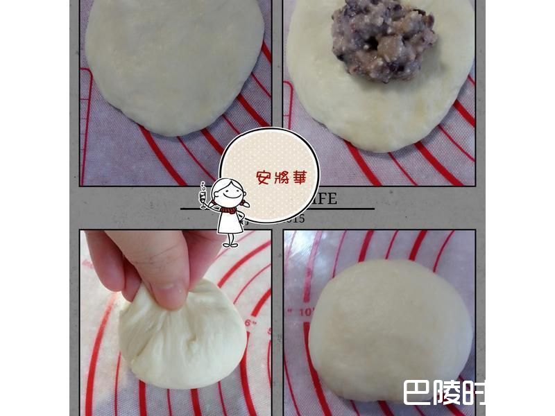 5取一面团,轻拍拍扁,加入适量的红豆奶酥酱,不要加太多,捏紧包合,收口朝下稍微滚圆,如果没法顺利包合,可以沾些手粉帮助包合。