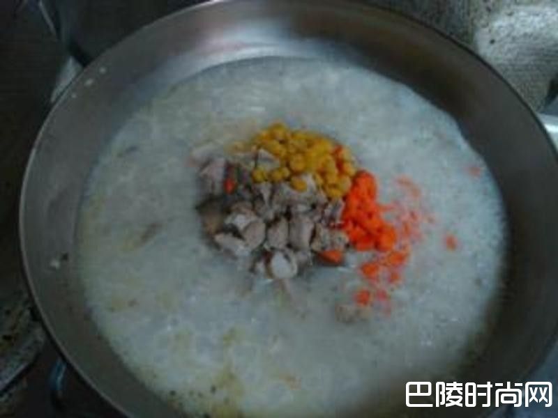 6【加料】这时将玉米粒,红萝卜,鸡肉加入拌炒,以小火闷煮入味约1分钟