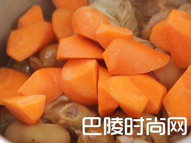 6加入胡萝卜,煮半小时,至板栗、胡萝卜黏软。