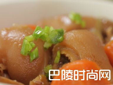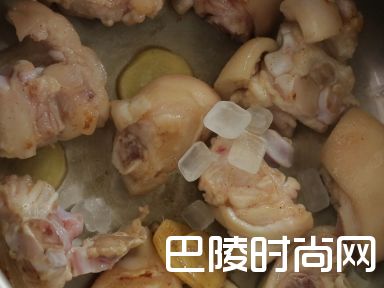 4热油锅,下腌制好的猪蹄块,大火翻炒2-3分钟,放入炖锅中。