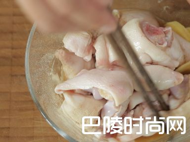 2取一个碗,加入猪蹄块,放入腌料,拌匀,腌制20分钟。