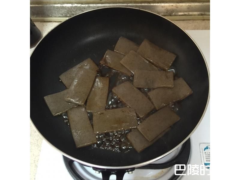 3蒟蒻墨玉板先切三等份后,再将中间切开不切断,形成口袋的造型,起热锅将墨玉板干煎,待表面水分干燥后淋上鲣鱼酱油,待收干后即可起锅放凉备用。