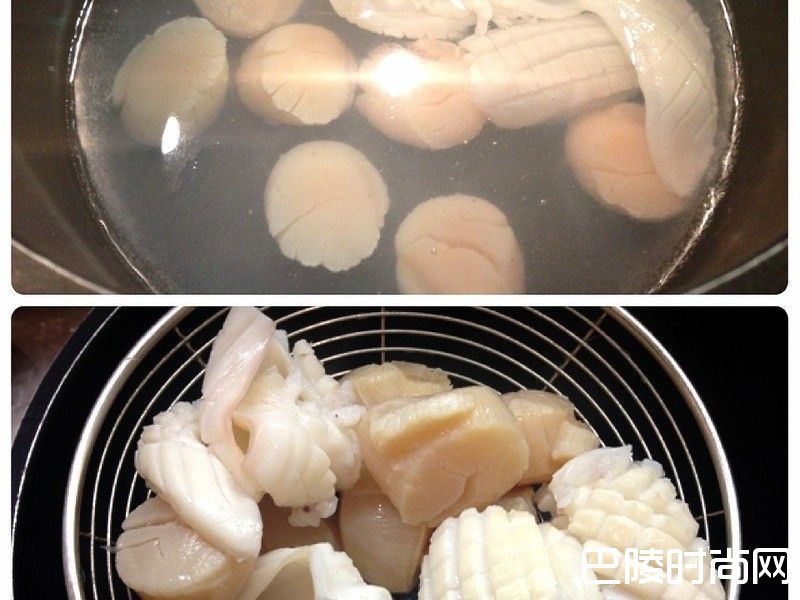 3烧滚一锅水,放入鲜贝和墨鱼片氽烫1分钟,捞起并沥干水分。