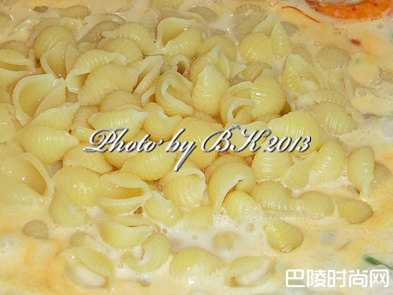 7煮到酱汁略收,加入调味料拌匀就完成了超级美味的「白酱海鲜贝壳面」囉!