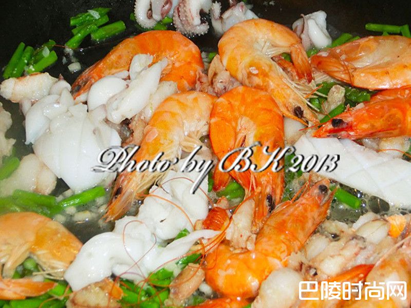 4加入鲜虾、蟹肉、芦笋、花枝拌炒。