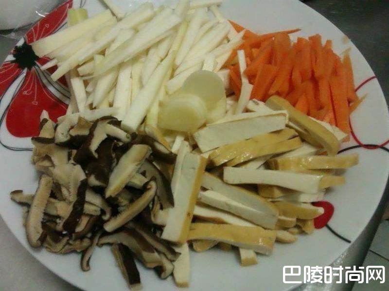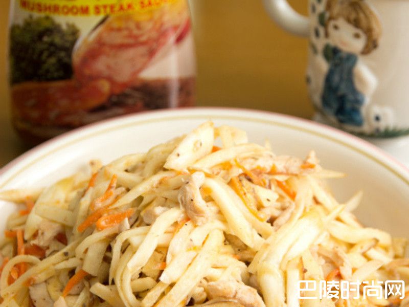 先将肉丝,用8佳酱醃过。筊白笋切丝备用。