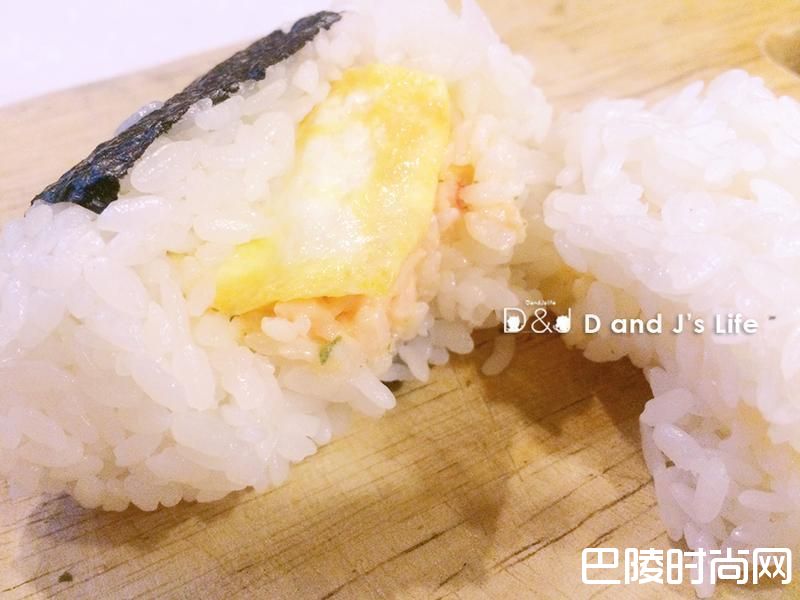 3制作饭团:用手捏2个三角形醋饭(厚度约1cm),接着1饭团+龙虾沙拉与蛋+另1个盖上去的饭团