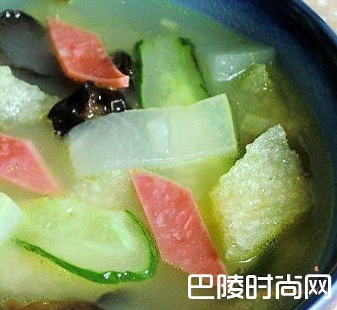做法1、冬瓜、肉皮切小块,黄瓜、火腿切薄片,木耳撕小块备用。