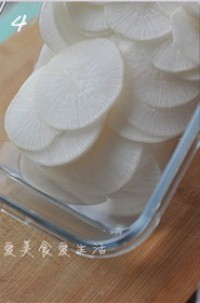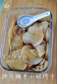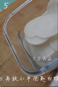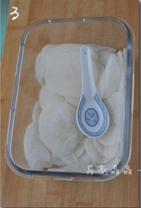 3.萝卜片用小半汤匙细盐,拌匀腌半个小时,让它出水.等待半小时过后,你会发现,萝卜出了很多水,这时候把水倒出,挤干