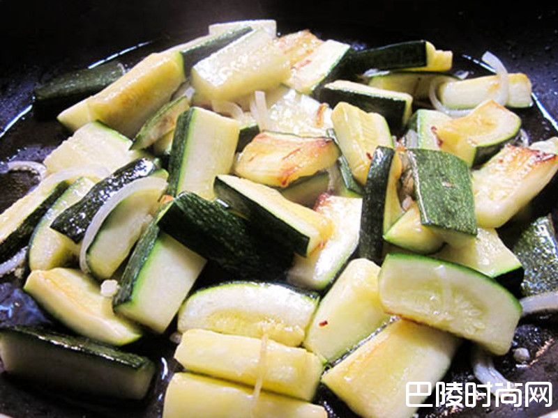 2橄榄油热锅后下节瓜和洋葱, 中火煎到每面呈金黄色.