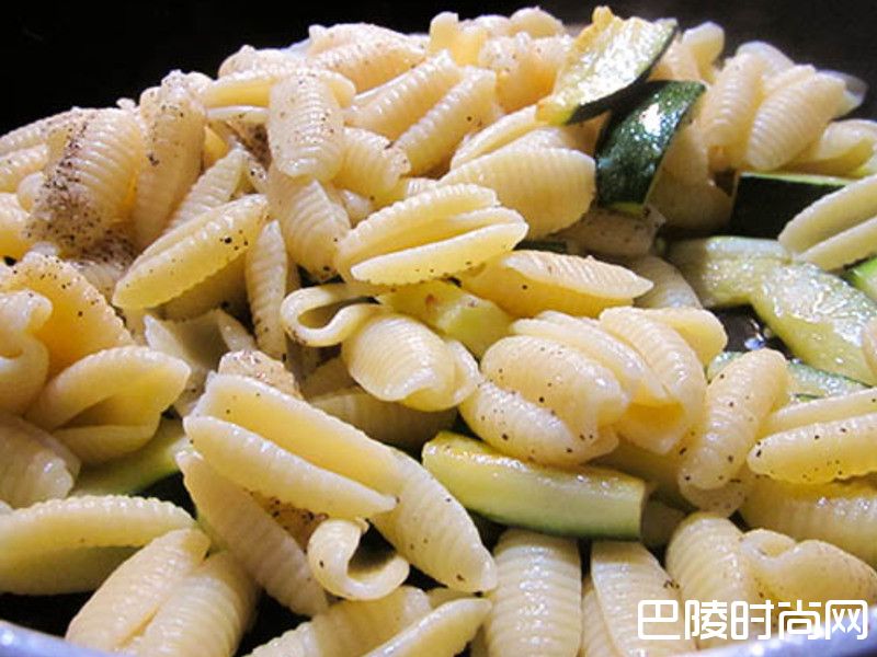 3倒入义大利面, 用盐和黑胡椒调味, 炒一分钟或至锅中无明显水分滞留即可熄火.