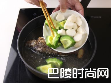 5加水,苦瓜和淮山,再高火煮20分钟
