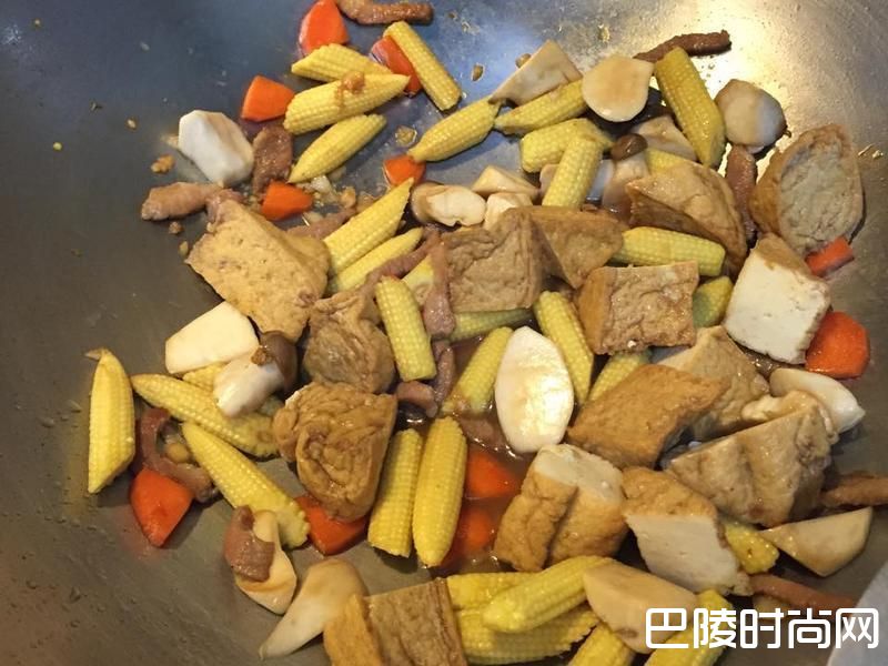 3把肉放进去炒香后,再加入红萝卜,玉米笋、杏鲍菇下去炒