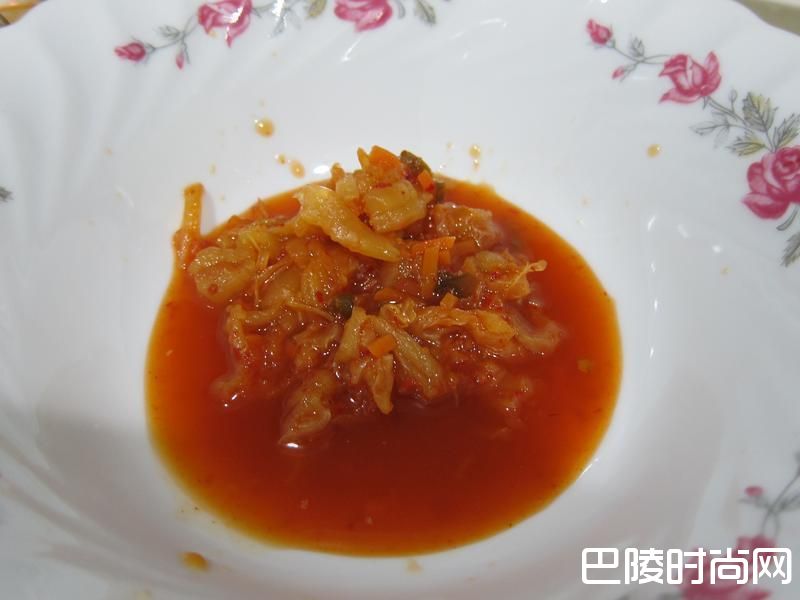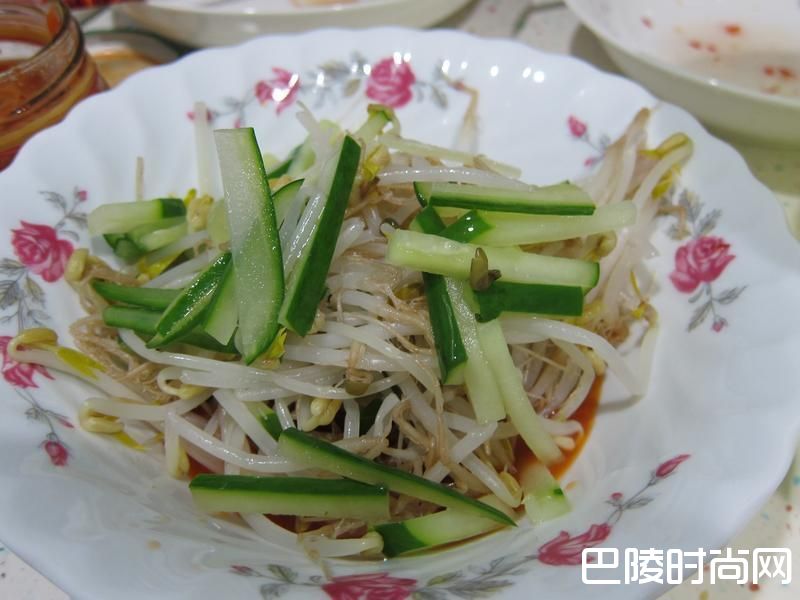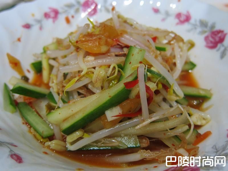 5将豆芽菜、小黄瓜、泡菜、辣椒丁、蒜末,加入适量的鲣鱼粉及香油,拌匀