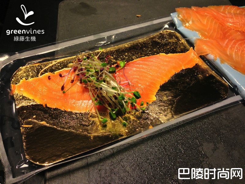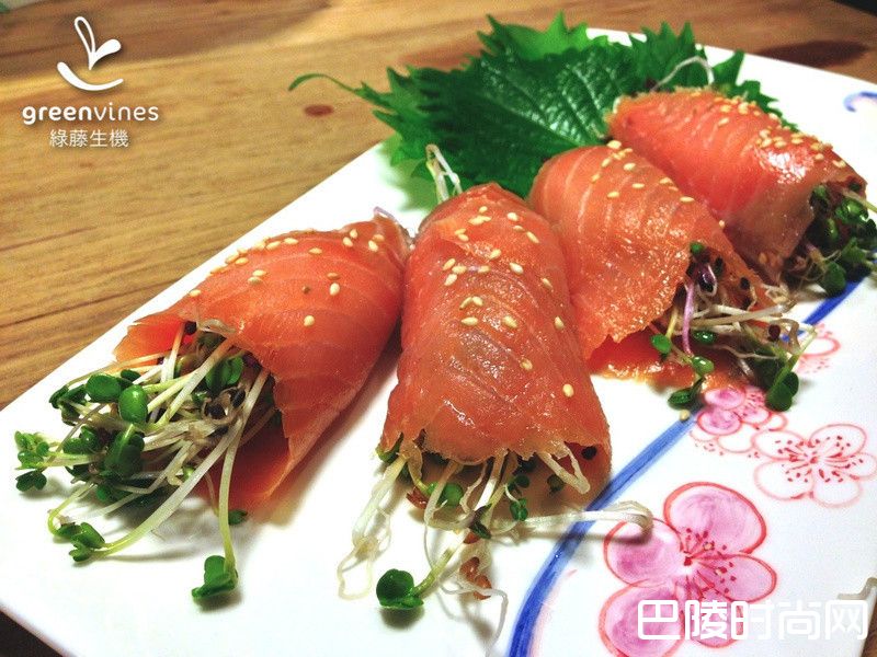 绿藤生机青花椰苗,紫高丽苗各30克(约1/4盒) 鲑鱼片4片(约150克) 紫苏2片 酱油,芥末一小碟 做法