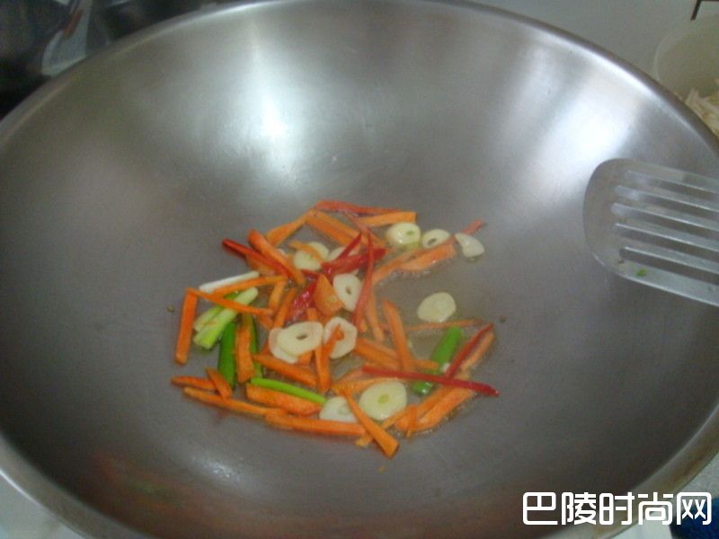 2步骤2起油锅爆香蒜片.辣椒.葱段.红萝卜.