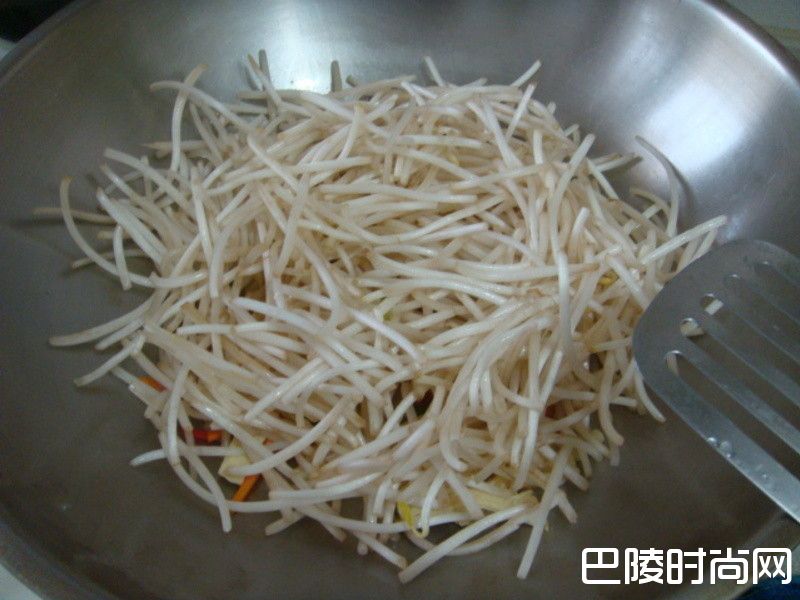 3步骤3下豆皮.豆芽菜.拌炒约一分钟.沿锅边呛些米酒.水.再拌炒均匀.