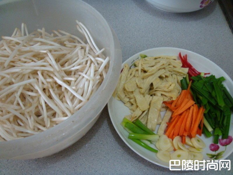 豆皮2片 豆芽菜1斤 葱1支 辣椒少许 辣椒少许 蒜头1粒 红萝卜适量 盐1茶匙 米酒1茶匙 韭菜3支 做法