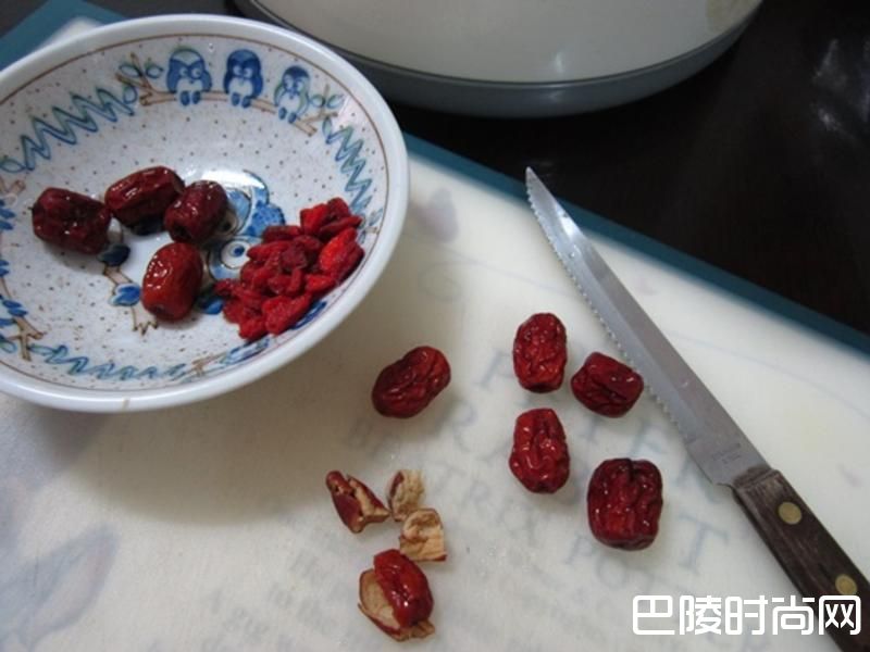 3等待粥煮开时,将红枣洗净去核,切成丁备用。