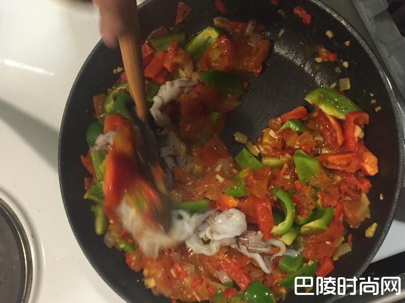 2放入黄红青椒及鱿鱼,直到煮熟。