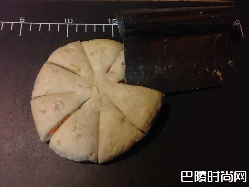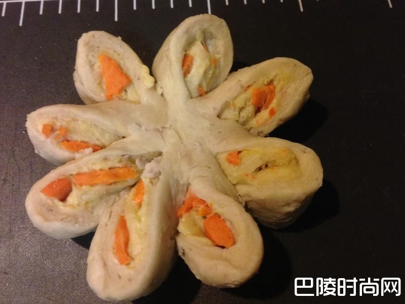 29将每片面团往同一顺时方向外翻,就会有那像花一样漂亮的花瓣状唷!!