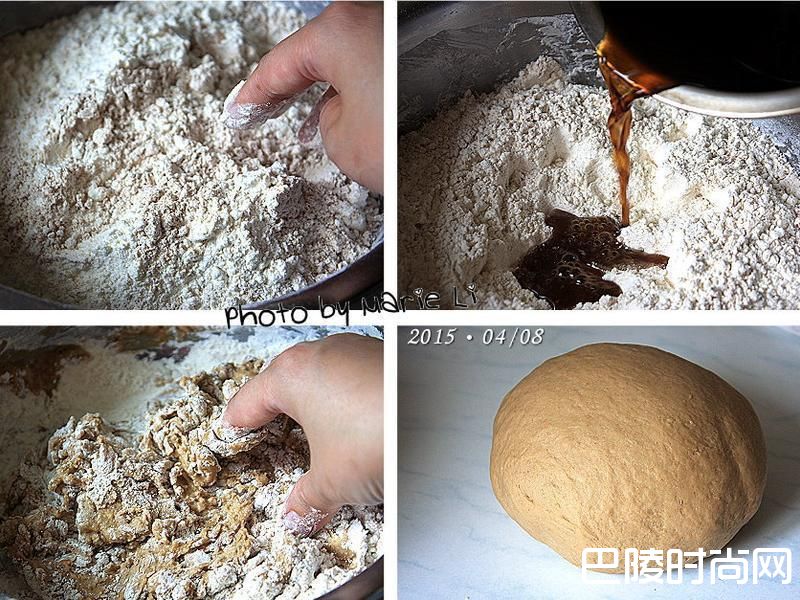 2先拌匀面粉和酵母粉,再倒入黑糖水用手抓拌均匀,捏合搓揉成一个光滑面团。盖上保鲜膜静置 2~3个小时即成为《中种面团》
