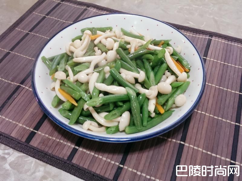 2、热锅后放2匙的油,把蒜片及红萝卜丝爆香,加入四季豆,炒约1分钟后,再把白玉菇放入锅内,以盐、鸡粉调味,均匀拌炒后就可以盛盘了哦!