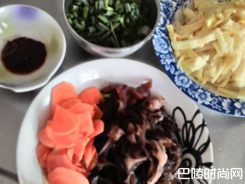 黑木耳4片 笋干一盘 豆瓣酱1大匙 酱油 糖 盐适量 水半碗 葱花 红萝卜片适量 做法