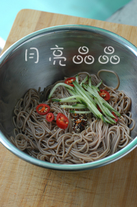4、捞出荞麦面沥干水份,淋上一汤匙橄榄油拌匀后,调入米醋2汤匙(30ml)、生抽2茶匙(10ml)、糖一茶匙(5g)、一点点盐和一小勺辣椒油拌匀后,再加入辣椒片、黄瓜丝、熟白芝麻一小把拌匀即可