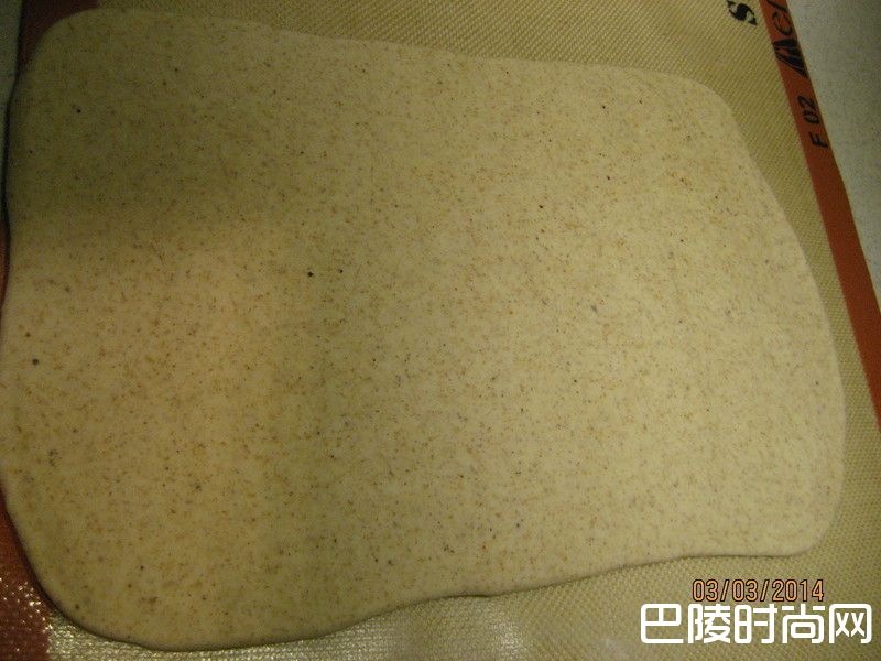 3将面团擀成长方形,同时尽量压出面团内气泡。