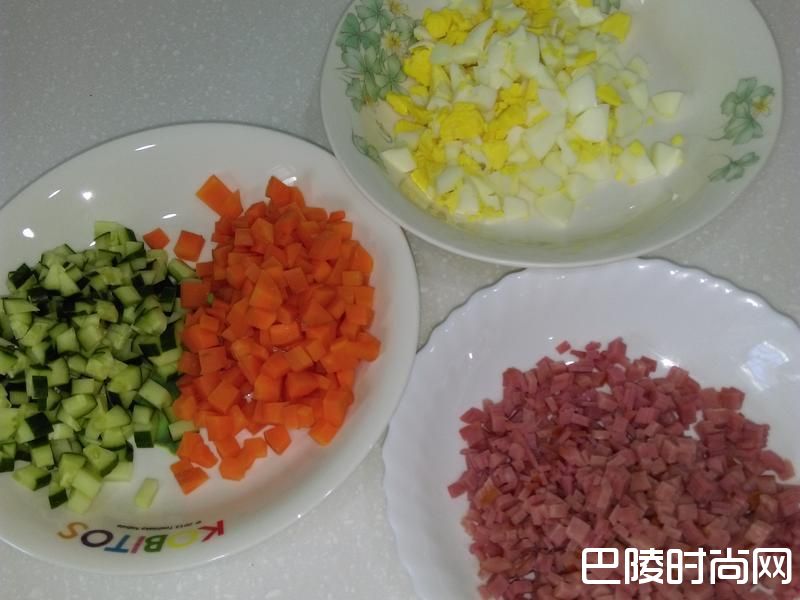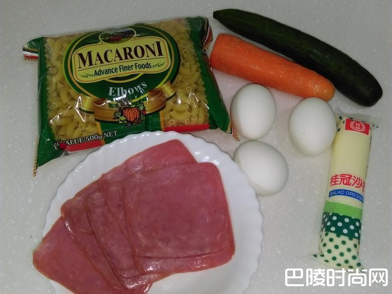 义大利面(弯管面)1包 小黄瓜1条 胡萝卜半条 水煮蛋3个 火腿片5片 沙拉酱5大匙 蕃茄酱3大匙 盐半茶匙 橄榄油1大匙 做法